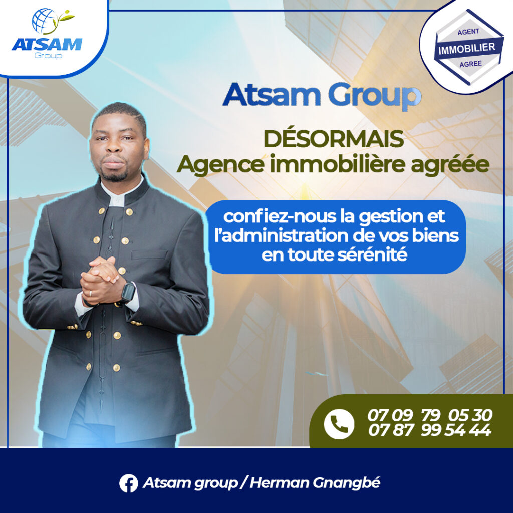 Atsam Group est une agence immobilière agréée sous l’arrêté n°23-00095/MCLU/DGLCV/CAPPI/ogla du 11 OCT 2023, spécialisée dans la gestion et la vente de biens immobiliers. Nous mettons à votre disposition une équipe expérimentée et dévouée, prête à s’occuper de tous les aspects de votre propriété, afin de vous offrir une tranquillité d’esprit totale.